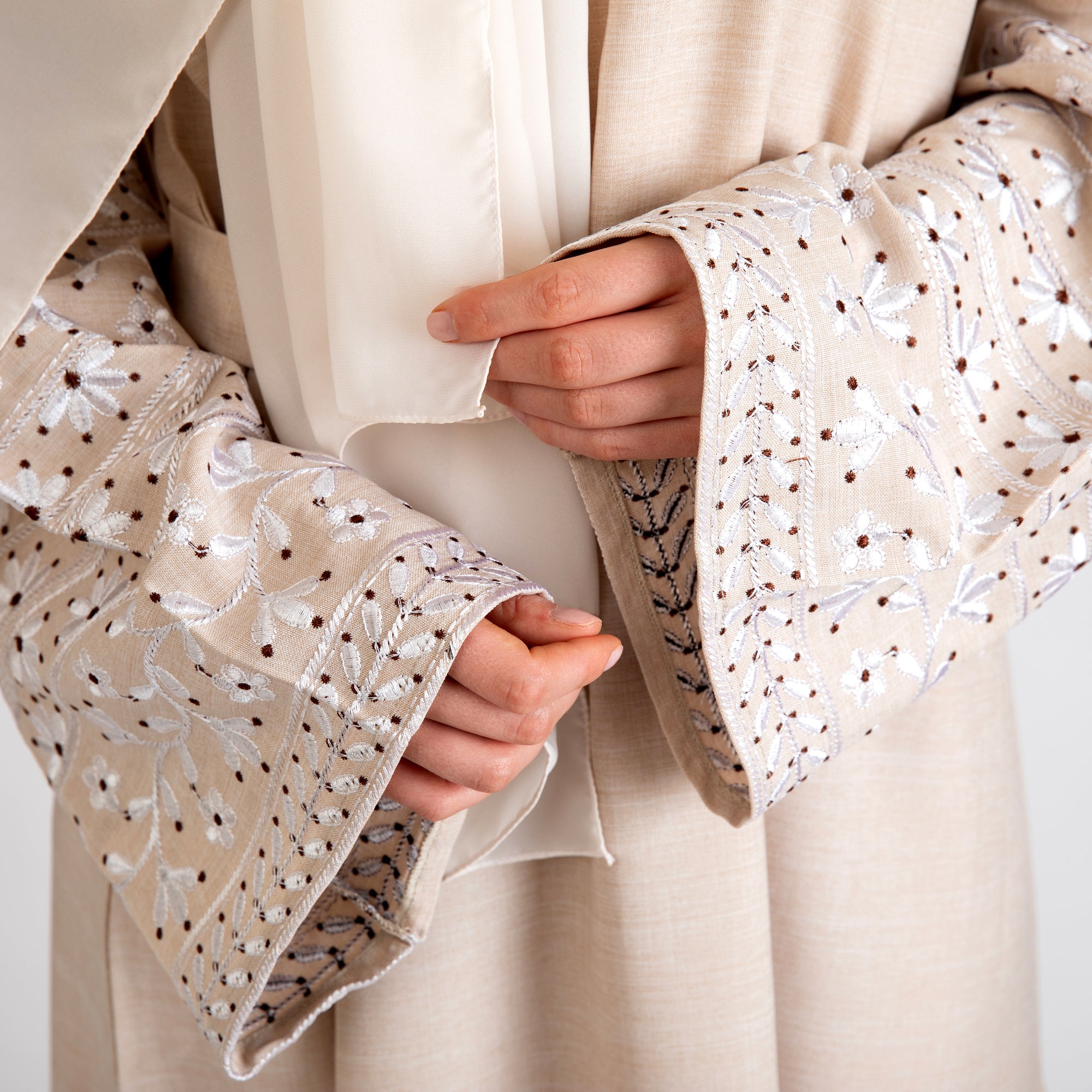 This closed linen abaya is a graceful garment, exuding an air of elegance and sophistication. Crafted from high-quality linen fabric, it offers a luxurious feel while maintaining breathability and comfort. Its loose and flowing silhouette drapes effortlessly allowing for ease of movement. The defining feature of this abaya lies in its floral embroidery adorning the sleeves, adding a touch of femininity and charm to the overall design.